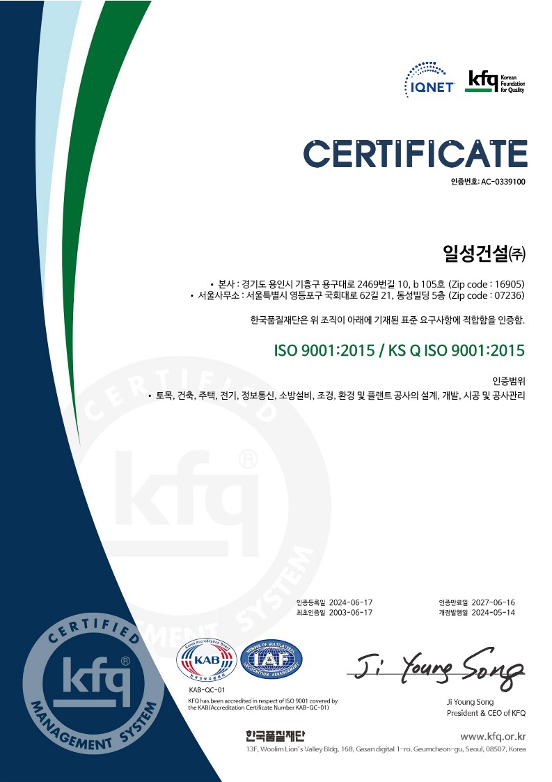 일성건설(주)는 국내 · 외 토목, 건축, 주택, 조경, 기계, 전기, 정보통신, 환경, 플랜트 건설 분야의 공사관리, 설계, 조달, 시공 및 서비스 업무를 수행함에 있어서 당사의 경영방침을 바탕으로 "최상의 품질과 신뢰성으로 고객의 요구를 만족" 시킴을 품질방침으로 하여 회사의 이익 창출과 고객 만족을 극대화하는데 그 목적이 있습니다