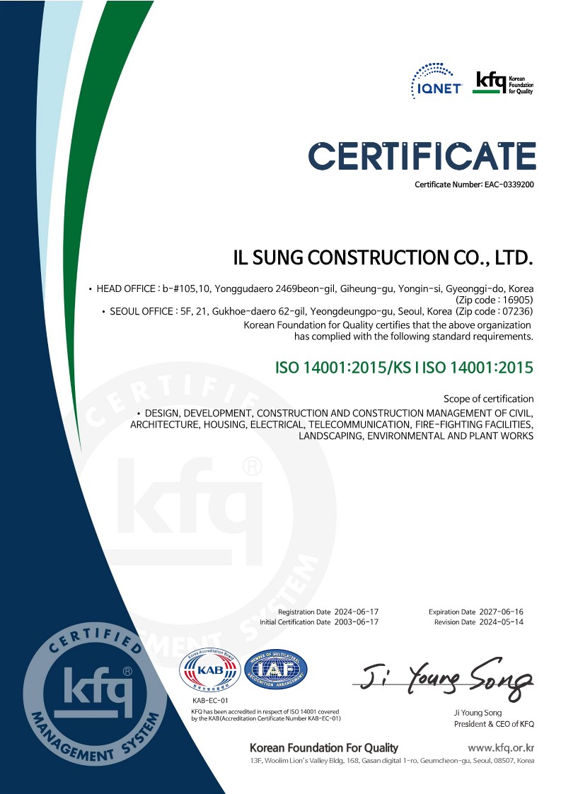 Il Sung Construction Co., Ltd. set and promote an environment policy as follows for eco-friendly management based on Il Sung Construction Co., Ltd.’s management philosophy, long-term vision and quality policy,